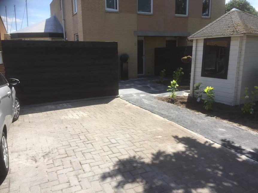 In Lemmer hebben we de hele tuin aangepakt. We hebben antraciete gecoate tegels gelegd in combinatie met een grijs vlak. Schuttingen geplaatst met prachtige zwarte potdeksel planken. Een padje naar de voordeur bestraat met antraciete waaltjes en we hebben hier de beplanting verzorgd.